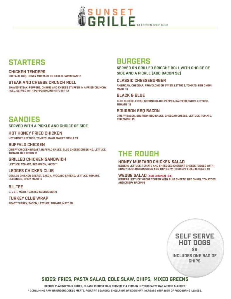 After an exhilarating round of golf, enjoy great appetizers, sandwiches and entrees in our restaurant at The Ledges, while viewing one of our high definition televisions, powered by DirecTV. Our full service bar offers an excellent variety of draft and bottled beers, wines by the glass and mixed drinks. Our open-air covered deck is a great spot to bring the entire family for spectacular views of the Pioneer Valley and the surrounding mountain range. Whether it’s Springtime with Mother Nature returning from midwinter hibernation, the lazy, hazy days of Summer or a Fall sunset in all its rhapsody of color, we are sure you will agree that dining at the Ledges is an experience not soon forgotten.
